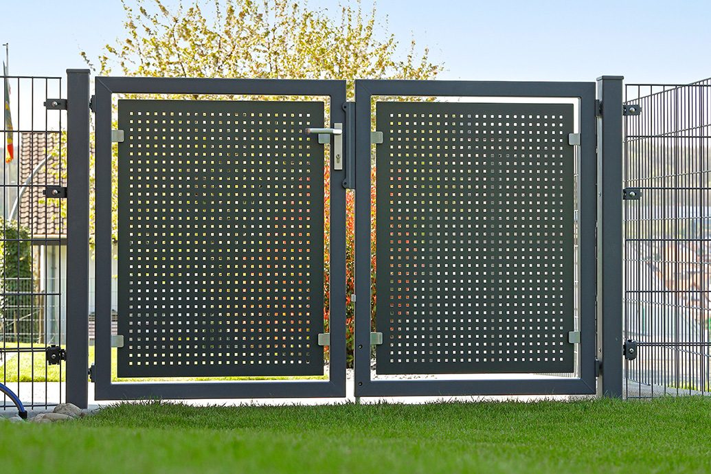 RANKO www.ranko.de RANKO MANUFAKTUR-TORE TECHNISCHE DATEN Andere Spezifikationen auf Anfrage. Aluminium-Lochblech RANKO MANUFAKTUR-TORE feuerverzinkt oder feuerverzinkt und beschichtet Rahmen: RR 60/40/2 Pfosten: (jeweils 750 mm länger als Torhöhe) QR 80/80 bis Flügelbreite 1500 mm, QR 100/100 bis Flügelbreite 2000 mm (größer als Höhe 1200 mm), 3x anschraubbare Zaunanschlusswinkel für Doppelstabmatten, 2x vormontierte höhenverstellbare 3D-Torbänder M16 mit 180° Öffnungsmöglichkeit (wahlweise DIN links/rechts verwendbar) Ausstattung: Rohrrahmenschloss, für PZ vorgerichtet (ohne Zylinder), Schilder, Drückergarnitur und vormontierter Anschlag aus Aluminium Bei 2-flg. Toren: 2 x Bodenhülse zur Arretierung des Feststellflügels im geöffneten/geschlossenen Zustand, 1 gesicherter Bodenriegel, 1 Feststeller für geöffneten Torflügel (zum Einbetonieren) Öffnungsrichtung bitte angeben! Die Öffnungsrichtung des Tores muss vor dem Einbau des Schlosses festgelegt werden. ALUMINIUM-BLECH 3 mm, bei verzinkten Toren werden die Bleche standardmäßig in Weißaluminium RAL 9006 beschichtet ARTIKELNR. 66 ° * 10 x x 66 ° * 12 x x 66 ° * 15 x x 66 ° * 20 x x 66 ° * 30 x x 66 ° * 40 x x BREITE IN MM 1000, 1-flügelig 1250, 1-flügelig 1500, 1-flügelig 2000, 1-flügelig 3000, 2-flügelig 4000, 2-flügelig HÖHE IN MM 1000, 1200, 1400, 1600, 1800, 2000 1000, 1200, 1400, 1600, 1800, 2000 1000, 1200, 1400, 1600, 1800, 2000 1000, 1200, 1400, 1600, 1800, 2000 1000, 1200, 1400, 1600, 1800, 2000 1000, 1200, 1400, 1600, 1800, 2000 ° = Kurzbezeichnung Füllung: 2 = Aluminium-Lochblech 3 mm, Typ QG 10-30 (Quadratlochung 10 mm in geraden Reihen, Abstand Mitte zu Mitte des Quadrats 30 mm), mit Klemmhaltern aus Edelstahl im Rahmen befestigt 6 = Aluminium-Blech 3 mm, mit Klemmhaltern aus Edelstahl im Rahmen befestigt 7 = Aluminium-Blech 3 mm, auf Rahmen aufgenietet (Nieten sichtbar) * = Farbkurzbezeichnung: 1 = Feuerverzinkt, 2 = Moosgrün RAL 6005, 5 = Anthrazitgrau RAL 7016 x x = Höhenkurzbezeichnung: 10 = 1000 mm, 12 = 1200 mm, 14 = 1400 mm, 16 = 1600 mm, 18 = 1800, 20 = 2000 mm Andere RAL- und DB-Farben auf Anfrage. TRESPA®-PLATTEN 6 mm, mit Klemmhaltern aus Edelstahl im Rahmen befestigt. Bei verzinkten Toren ist die Trespa®-Platte ähnlich Steingrau RAL 7030, bei beschichteten Toren ähnlich Anthrazitgrau RAL 7016 ARTIKELNR. 663 * 10 x x 663 * 12 x x 663 * 15 x x 663 * 20 x x 663 * 30 x x 663 * 40 x x BREITE IN MM 1000, 1-flügelig 1250, 1-flügelig 1500, 1-flügelig 2000, 1-flügelig 3000, 2-flügelig 4000, 2-flügelig HÖHE IN MM 1000, 1200, 1400, 1600, 1800, 2000 1000, 1200, 1400, 1600, 1800, 2000 1000, 1200, 1400, 1600, 1800, 2000 1000, 1200, 1400, 1600, 1800, 2000 1000, 1200, 1400, 1600, 1800, 2000 1000, 1200, 1400, 1600, 1800, 2000 * = Farbkurzbezeichnung: 1 = Feuerverzinkt, 5 = Anthrazitgrau RAL 7016 x x = Höhenkurzbezeichnung: 10 = 1000 mm, 12 = 1200 mm, 14 = 1400 mm, 16 = 1600 mm, 18 = 1800, 20 = 2000 mm Andere RAL- und DB-Farben auf Anfrage. Trespa®-Platten 81